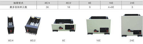 有五種尺寸都是以8E(200mm)高度,進行模塊化結構設計,其有效元器件安裝高度為1800mm,使柜體整體布局更合理,更美觀。 8E/4在8E高度空間平行組合4個抽屜單元;