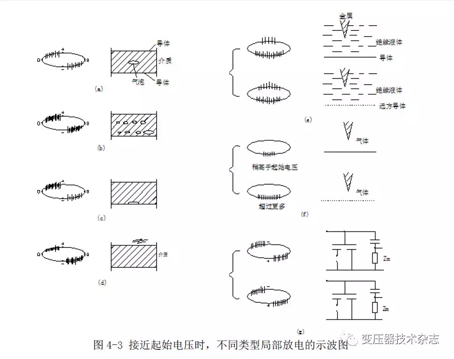 (d)中,(1 )一簇不同尺寸的氣隙位于電極的表面,但屬封閉型;(2 )電極與絕緣介質的表面放電氣隙不是封閉的。放電脈沖疊加于電壓的止及負峰值之前兩邊幅值比通常為3:1,有時達10:1。隨電壓上升,部份脈沖向零位方 向移動.放電起始后,脈沖分辨率尚可;繼續升壓,分辨率下降直至不能分辨。放電起始后放電皇隨電壓的上升逐漸增大,熄滅電壓等于或略低于起始電壓。如電壓 持續時間在10 min以后,放電響應會有些變化。