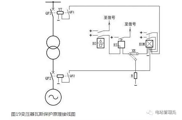 變壓器瓦斯保護的主要元件就是瓦斯繼電器,它安裝在油箱與油枕之間的連接管中。當變壓器發生內部故障時,因油的膨脹和所產生的瓦斯氣體沿連接管經瓦斯繼電器向油枕中流動。若流動的速度達到一定值時,瓦斯繼電器內部的擋板被沖動,并向一方傾斜,使瓦斯繼電器的觸點閉合,接通跳閘回路或發出信號,如圖19所示:瓦斯繼電器KG的上觸點接至信號,為輕瓦斯保護;下觸點為重瓦斯保護,經信號繼電器KS、連接片XE起動出口中間繼電器KOM,KOM的兩對觸點閉合后,分別使斷路器QF1、QF2、跳閘線圈勵磁。跳開變壓器兩側斷路器,即:
