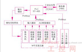 為能對變壓器的溫度進行實時監測和控制,要求設計的系統能對多臺變壓器的繞組和鐵心溫度進行測量,實時在hmi上顯示,并能對數據進行分析,一旦溫度超出設定最高溫度時進行聲光報警,達到極限設定溫度時自動切除負荷進行保護。當溫度達到強制散熱設定值時,啟動風扇進行強制散熱。服務器能對變壓器的溫度進行記錄,并能生成曲線圖,隨時能為技術人員提供查詢。