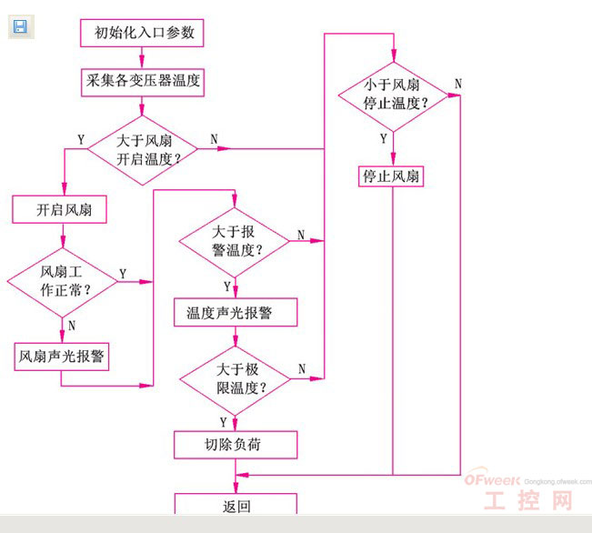 人機界面用來顯示每臺變壓器的溫度,并可以方便的設置系統的參數,如報警溫度值,切除負荷溫度值,啟/停風扇溫度值等參數。可以實時查看每臺變壓器的繞組和鐵心的溫度,并可以顯示變壓器負荷和溫度關系曲線。必要時還可通過hmi上的按鈕,手動啟/停風機,消除報警及切除負荷等操作。在服務器上,記錄著各種報警信息及故障發生時的各相溫度值、時間等信息,可按時間條件進行查詢,并根據需要進行打印和負荷圖表輸出。該系統中的數據采集處理、風機運行和故障報警由plc和hmi通過編制的相應程序來完成。