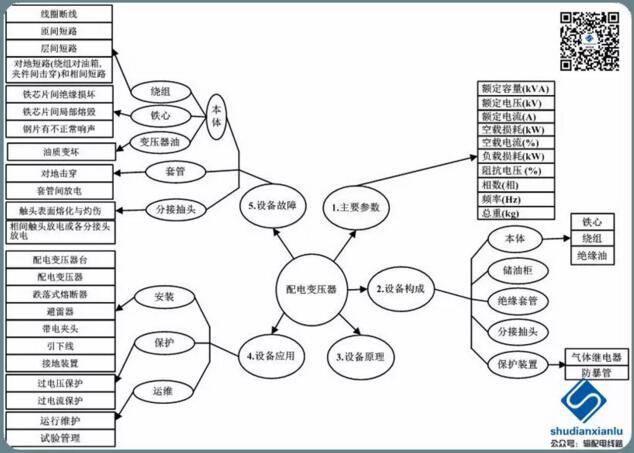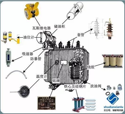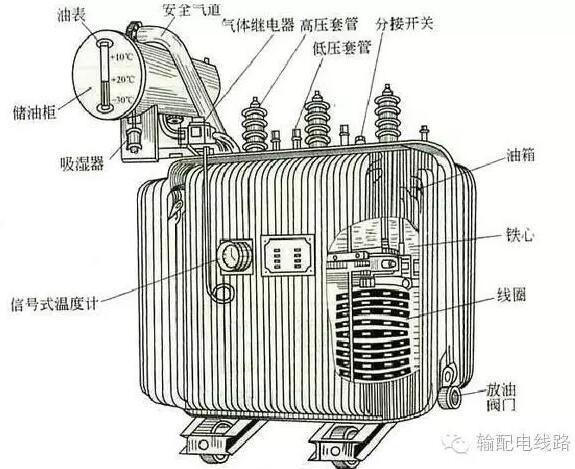 本次小編以油浸式配電變壓器進行結構介紹,油浸式配電變壓器按其結構可分為本體、儲油柜、絕緣套管、分接開關、保護裝置等。如下圖