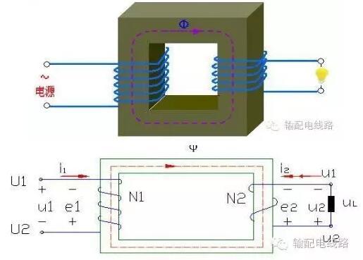 鐵心的作用是加強兩個線圈間的磁耦合。為了減少鐵內渦流和磁滯損耗,鐵心由涂漆的硅鋼片疊壓而成;兩個線圈之間沒有電的聯系,線圈由絕緣銅線(或鋁線)繞成。一個線圈接交流電源稱為初級線圈(或原線圈),另一個線圈接用電器稱為次級線圈(或副線圈)。實際的變壓器是很復雜的,不可避免地存在銅損(線圈電阻發熱)、鐵損(鐵心發熱)和漏磁(經空氣閉合的磁感應線)等,為了簡化討論這里只介紹理想變壓器。理想變壓器成立的條件是:忽略漏磁通,忽略原、副線圈的電阻,忽略鐵心的損耗,忽略空載電流(副線圈開路原線圈線圈中的電流)。例如電力變壓器在滿載運行時(副線圈輸出額定功率)即接近理想變壓器情況。