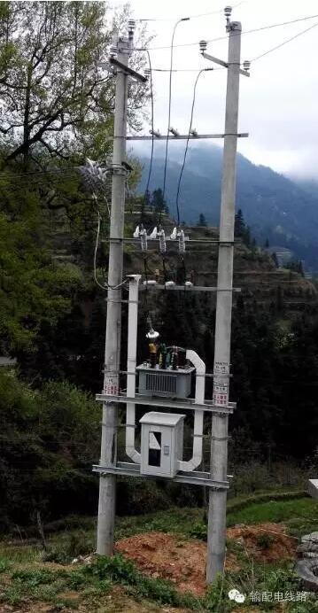 變壓器、高壓跌落式熔斷器和高壓避雷器裝在同一根電桿上。結構簡單,安裝方便,用料少,占地少,適用于安裝50KVA以下的配電變壓器.