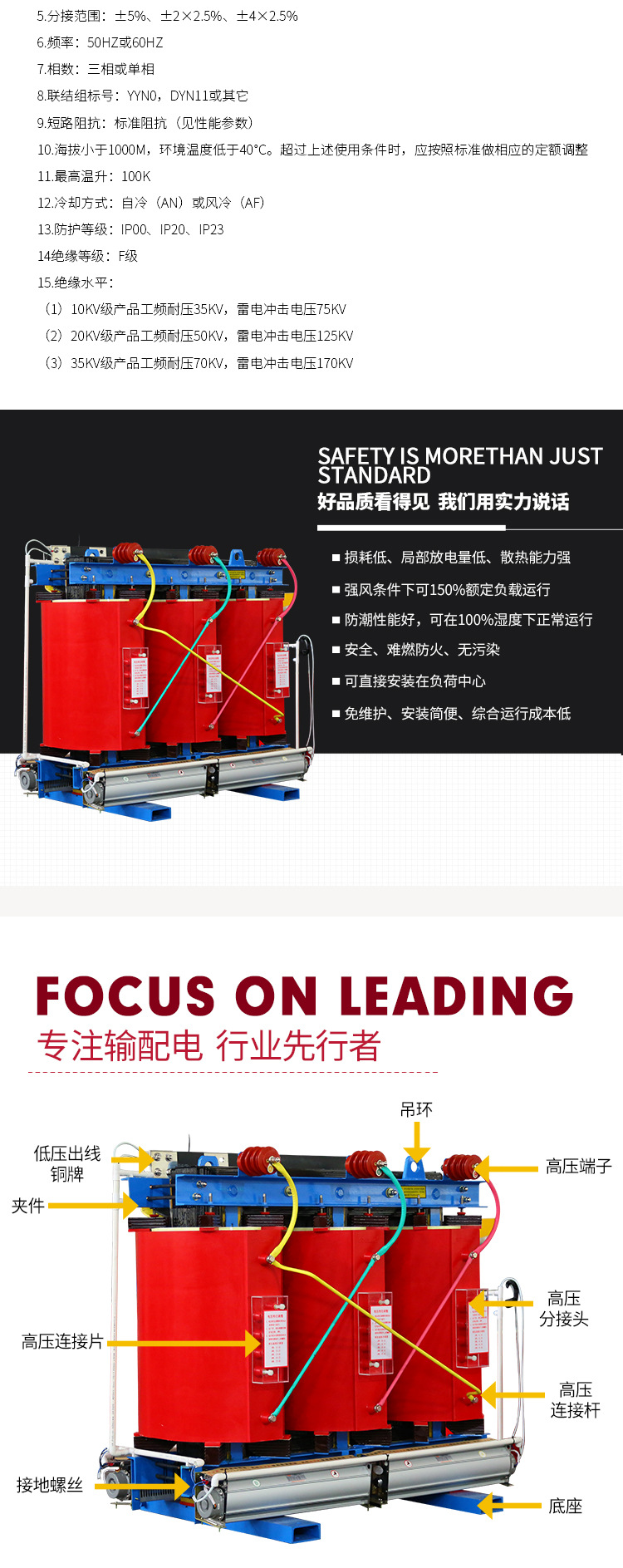 突出優勢:損耗低、節能、運行經濟、免維護、工藝結構先進、抗短路、雷電沖擊水平高外,還具有阻然、防潮、防塵、噪聲低等特點